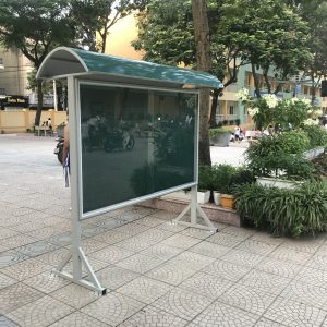 Hệ thống khung mái tre ,chân bảng làm từ sắt hộp sơn tĩnh điện ,bánh xe nhựa đặc chịu lực có chốt hãm an toàn khi cần thiết