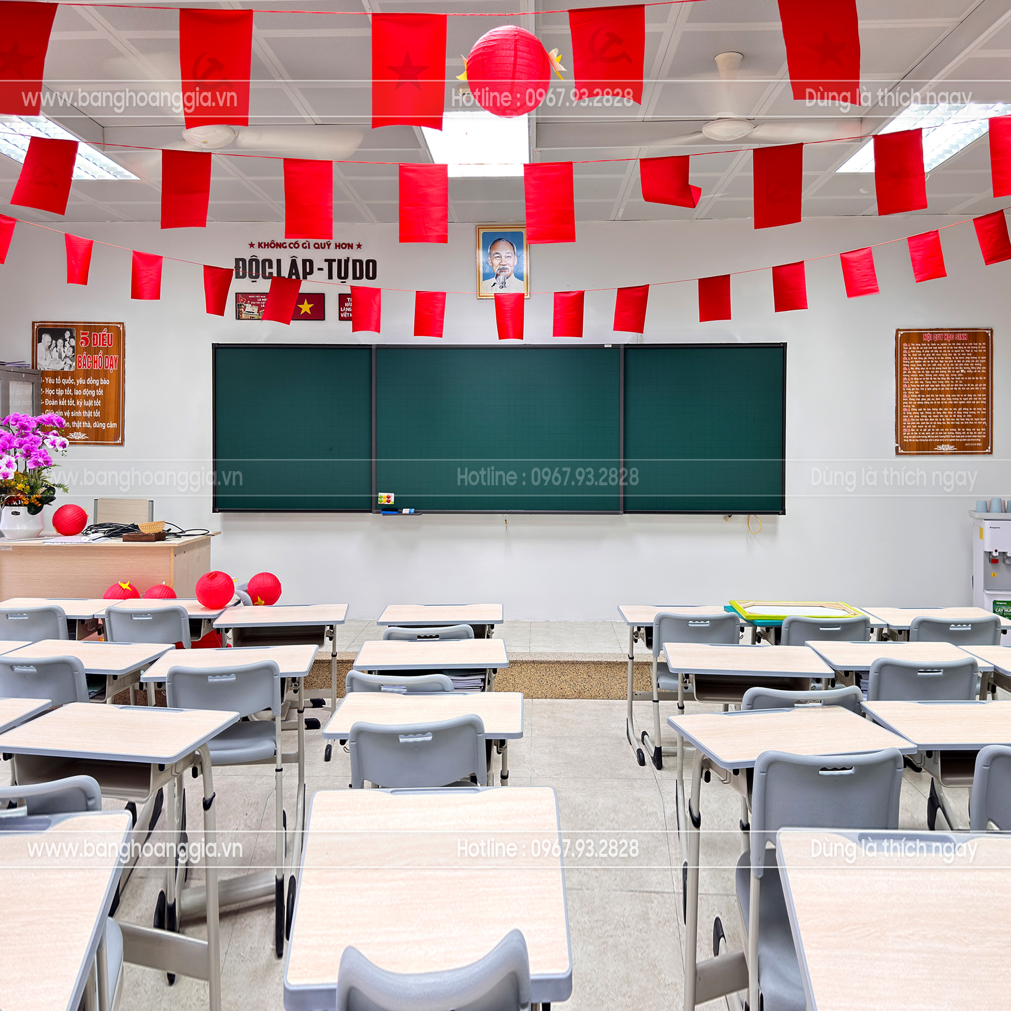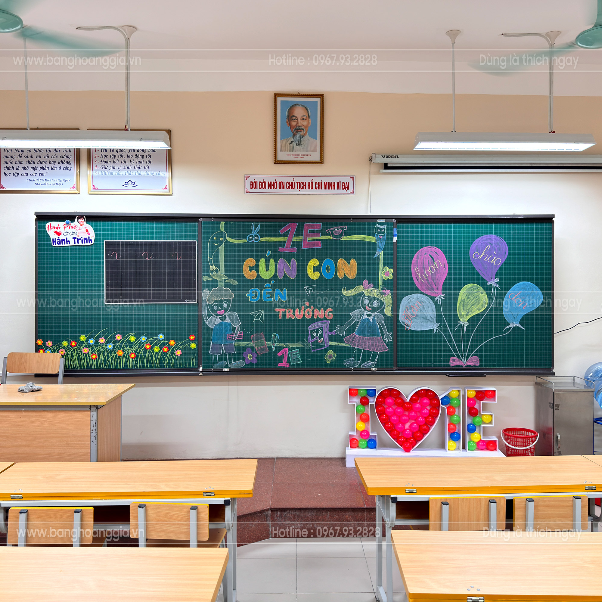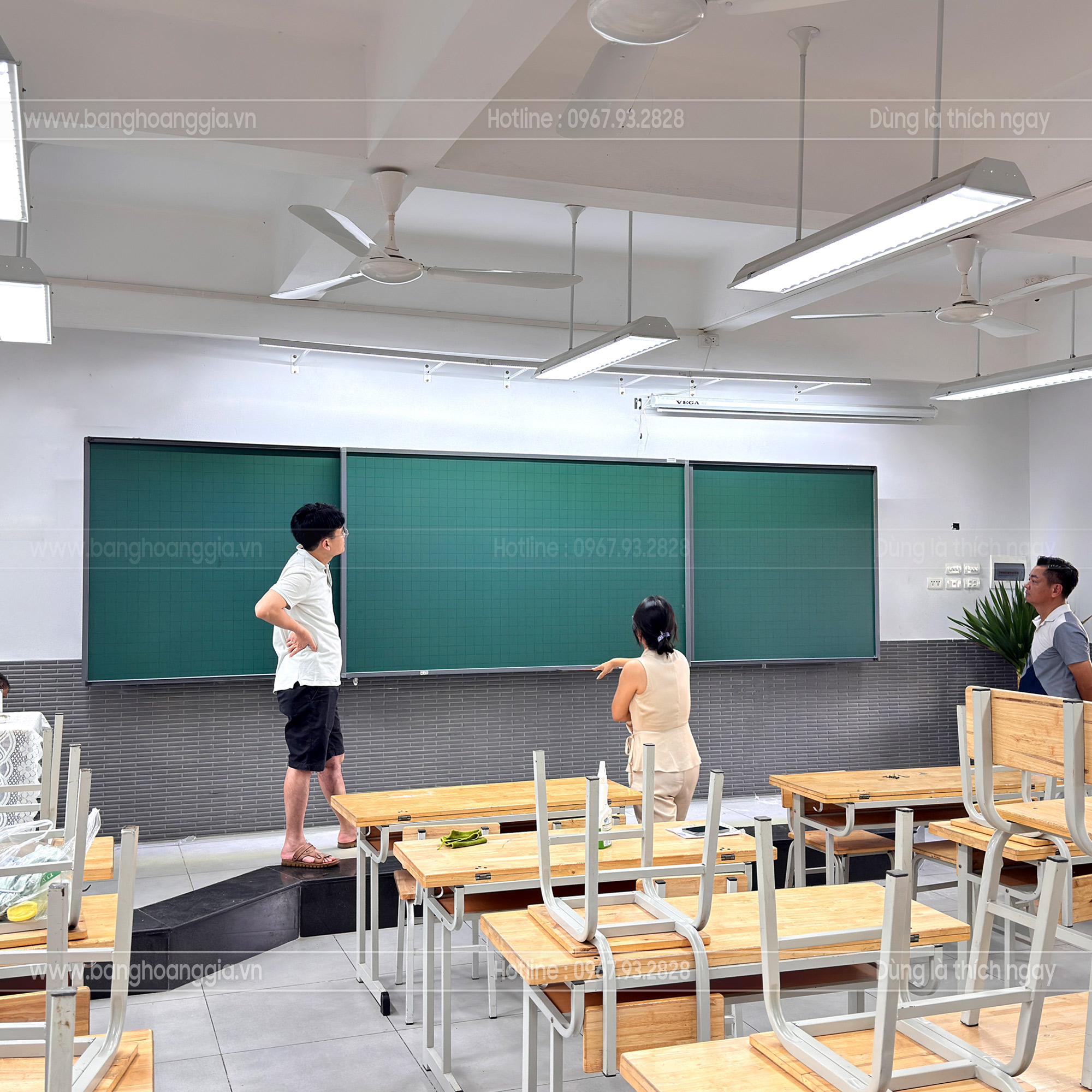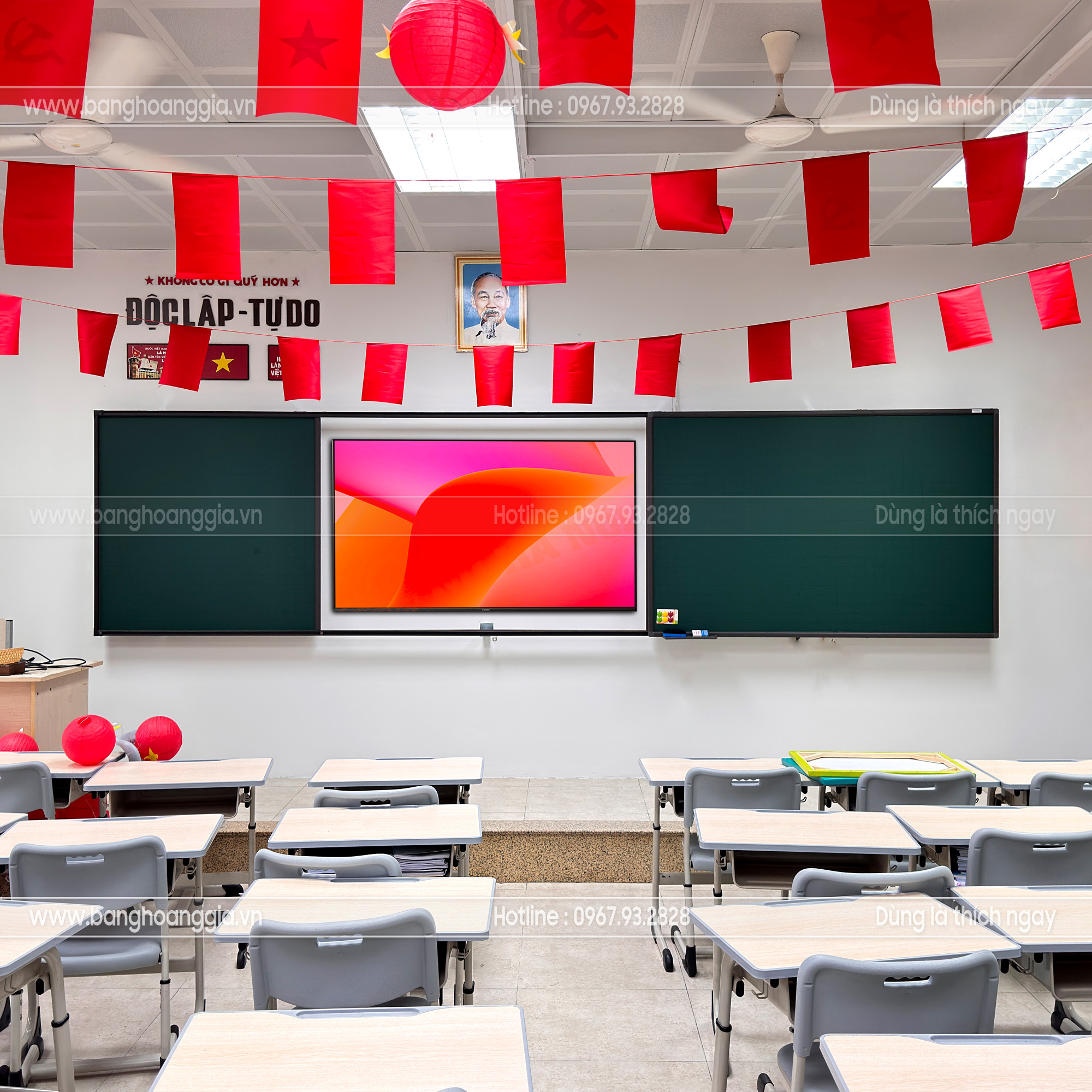 Bảng trượt 3 cánh 2 lớp viết phấn kết hợp tivi thông minh Bảng Hoàng Gia