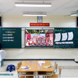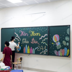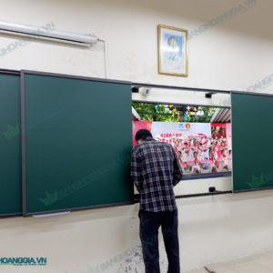 | Lớp ngoài gồm : 2 bảng từ Hàn Quốc Xanh có dòng kẻ mờ 5x5cm kích thước 1220x900mm( bảng dài 3m6), 1220x1000mm ( bảng dài 4m) …., khung nhôm đồng màu ray, trượt trên ray. Cạnh trong của hai bảng trượt dùng nẹp nhôm chuyên dụng giúp hai bảng gần như liền khối khi gặp nhau, giúp giáo viên dễ dàng viết tràn từ bảng này sang bảng kia. |