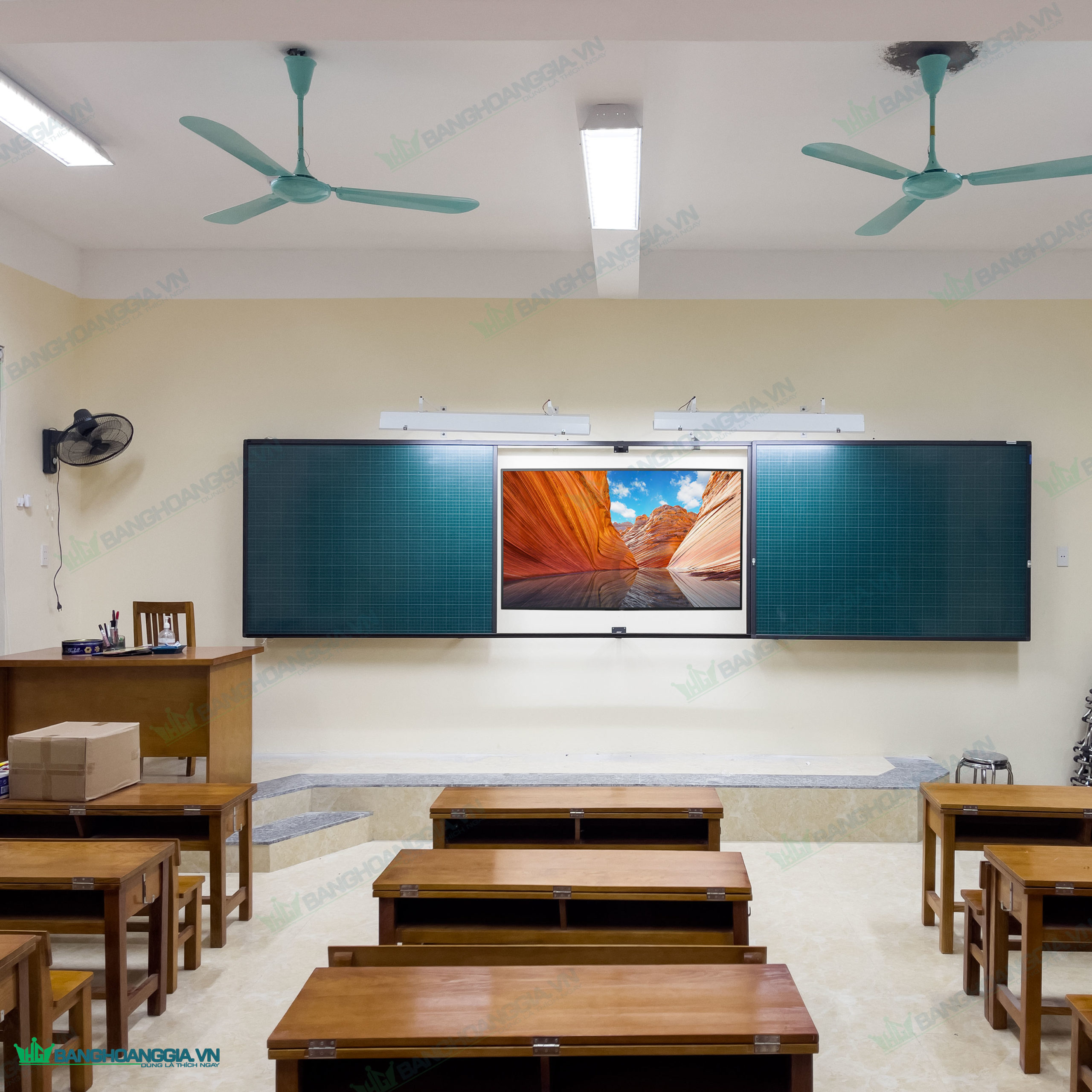 | Lớp ngoài gồm : 2 bảng từ Hàn Quốc Xanh có dòng kẻ mờ 5x5cm kích thước 1220x900mm( bảng dài 3m6), 1220x1000mm ( bảng dài 4m) …., khung nhôm đồng màu ray, trượt trên ray. Cạnh trong của hai bảng trượt dùng nẹp nhôm chuyên dụng giúp hai bảng gần như liền khối khi gặp nhau, giúp giáo viên dễ dàng viết tràn từ bảng này sang bảng kia. |